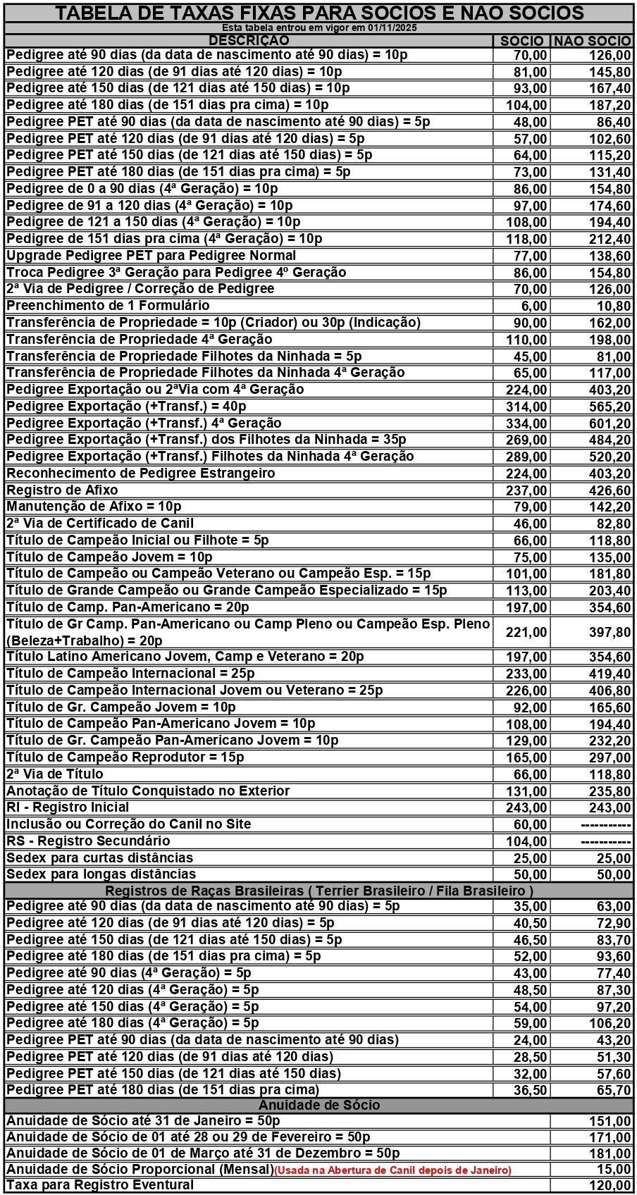OS REGISTROS DOS ANIMAIS SÃO CONTADOS EM DIAS CORRIDOS E "NÃO" EM MESES. CONTANDO DA DATA DE NASCIMENTO DO ANIMAL ATÉ A DATA DE ENTRADA DO DOCUMENTO NO KENNEL CLUBE.